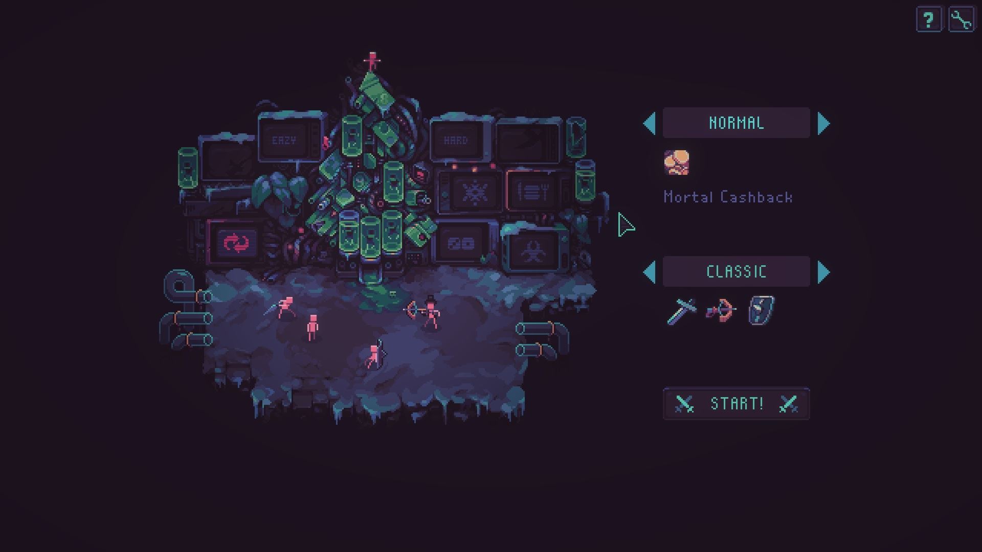 Po navolení novej hry, ktorá okrem easy a normal ponúkne aj iné obťažnosti, (buď po prejdení hlavnej hry alebo po splnení určitých úloh počas hrania) si taktiež môžete vybrať typy postáv či zbraní, s ktorými začínate. Hra síce určuje sériu postáv na výber, ale postupným splnením konkrétnych úloh bude ich výber väčší. Okrem postavičiek so zbraňami môžete začínať aj s nahým človiečikom, ktorému neskôr, keď budete chcieť, pridelíte zbraň / oblečenie.