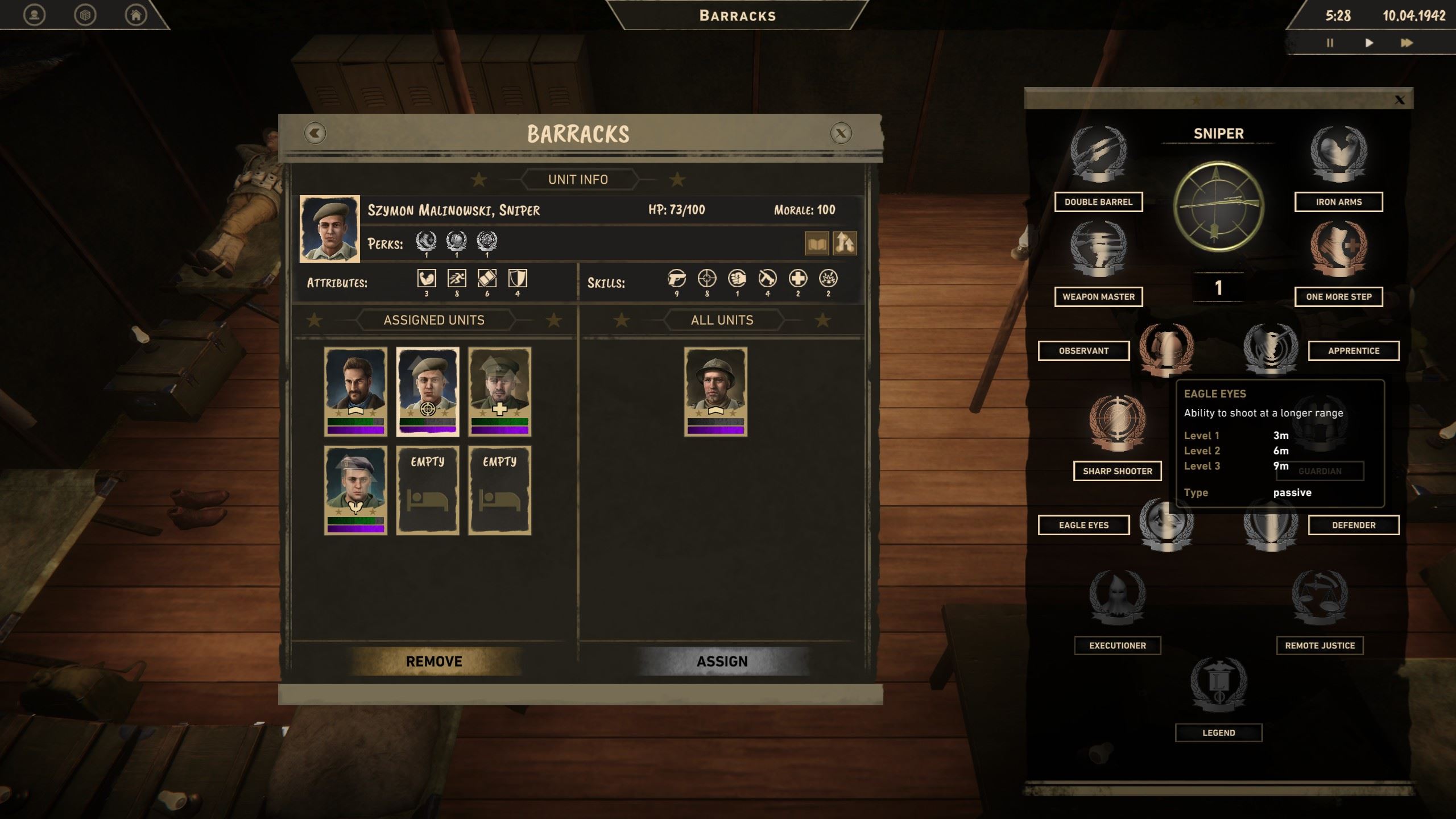 V tábore môžete aj najímať nových vojakov, ktorí majú rôzne atribúty a povolania. Po úspešnom nasadzovaní do akcie zbierajú skúsenosti a levely, za ktoré v kempe dostanú body na zvýšenie atribútov a ďalšie na perky, čo majú v hre formu medailí. Na základe povolania tak viete vojakom dopriať užitočné bonusy, ktoré spravidla majú tri stupne. Napríklad perk „šťastný bastard“ znamená 15-percentnú šancu, že inak presná nepriateľská strela vášho vojaka minie. Na druhej úrovni je to už 30 a na tretej 50%, čo je už veľmi pekná výhoda. Ďalšie perky zvyšujú presnosť streľby, dostrel, zvýšia počet akčných bodov alebo úplne odstránia krvácanie pri zranení.