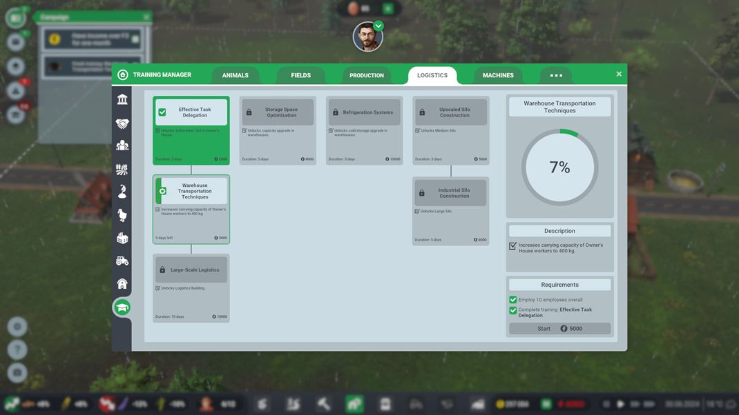Počas progresu je veľmi dôležitý manažment výcviku, čo je vlastne výskum v rôznych odvetviach - zvieratá, polia, produkcia, obchod, logistika, stroje... Jednotlivé technológie sa odomykajú na základe postupu v kampani a po splnení určitých podmienok, napríklad po výstavbe konkrétnych budov. Tieto výdobytky potom prinášajú skúsenejších zamestnancov a zvýšia ich kapacitu, možnosť zväčšovať polia, robiť výnosnejšie obchody, odomknú nové technológie a budovy.
