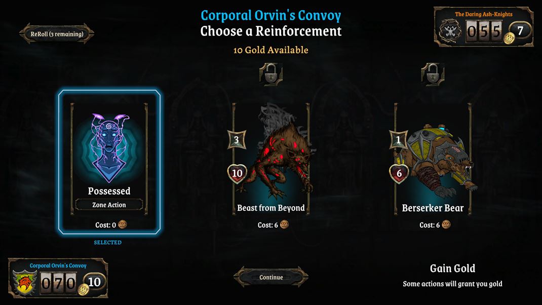 Pred ďalším súbojom si môžete vybrať jednu z troch jednotiek alebo súčastí, čo doplní vašu aktuálnu vojenskú skupinu. Rozhodnúť sa môžete podľa parametrov, ale aj ceny. Základné posily sú zdarma, za tie silnejšie už sa platí ťažko vybojovanými zlatkami. Ak chcete iný sortiment, máte tri pokusy na obmenu ponuky. Nasleduje ďalší súboj v rozšírenej oblasti, rozložíte doplnené sily a čakáte na výsledok.