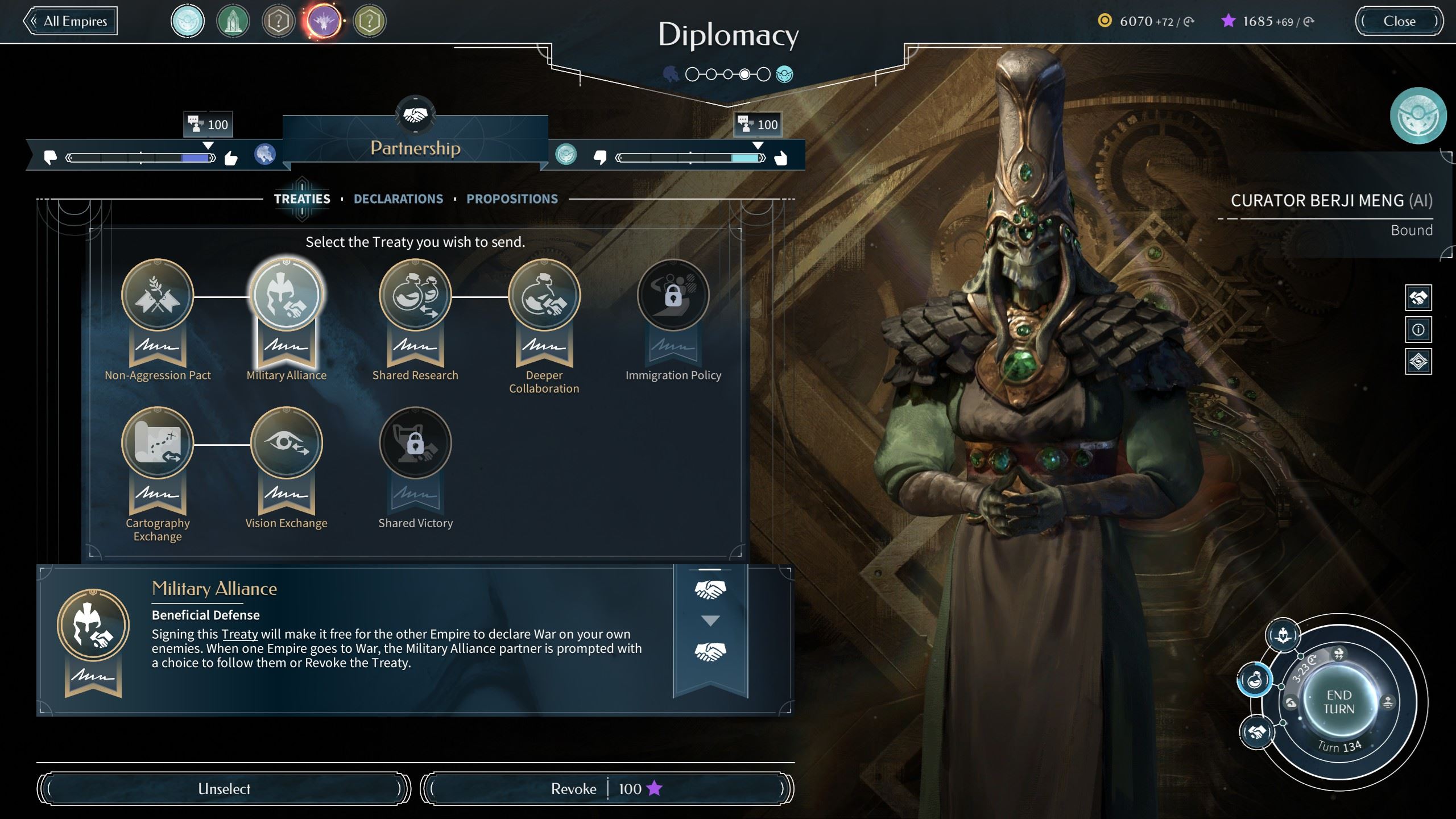 Pri vojnách hlavných frakcií môže konflikt skončiť vyhladením jednej z nich, ale často sa to skončí pokusom o zmier s tromi možnosťami, ako môže byť dosiahnutý mier. Frakcia, ktorá vo vzájomných bitkách získala viac bodov za vojnové úsilie, môže vyžadovať kapituláciu svojho rivala, ktorý navyše zaplatí určitú sumu. Biely mier je vzájomná dohoda bez reparácií. Napokon môže slabšia veľmoc zaslať ponuku a uznať svoju porážku.