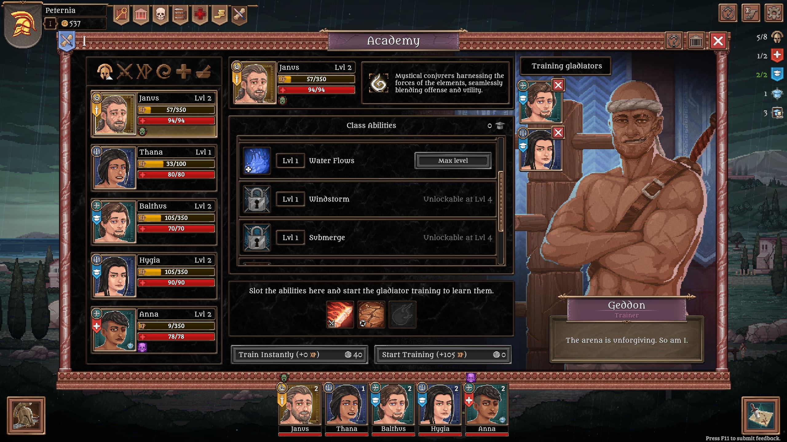 Práve tu sa naplno rozbieha manažment hry. Nastáva čas trénovať vlastných gladiátorov, ktorí budú pre vás získavať slávu a postupne sa prebojovávať rôznymi arénami. Bahir vám postupne vysvetlí základné mechaniky správy vily a tréningu gladiátorov. V tomto bode vzniká prvá výrazná podobnosť s Darkest Dungeon - len namiesto desivého zámku teraz obnovujete schátranú vilu.