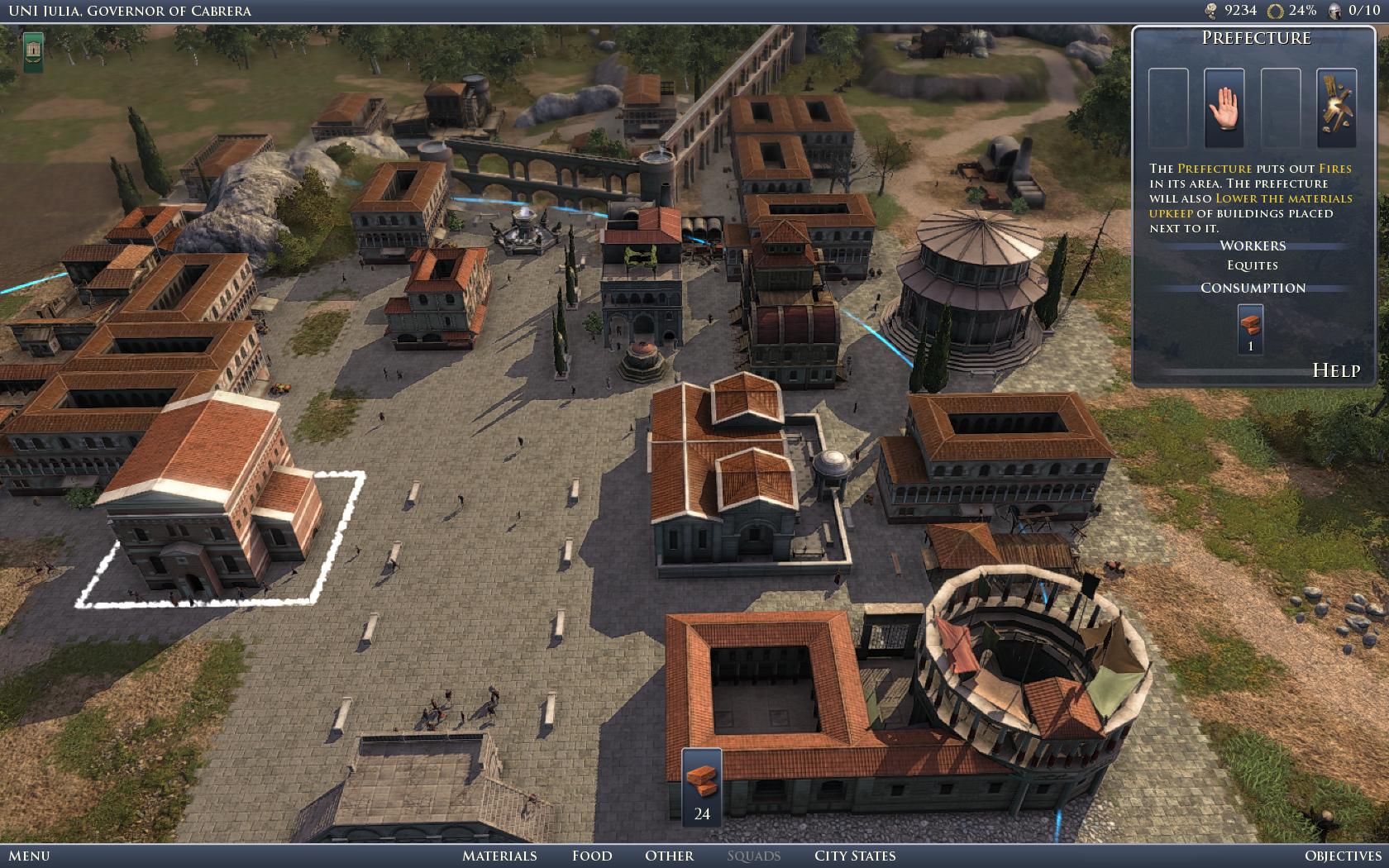 Aby ste postavili prvú funkčnú prefektúru, potrebujete najprv túto budovu vynájsť. Bádanie je podmienené výstavbou školy, ktorá generuje body výskumu. V prefektúre môžu pracovať len mešťania druhej, vyššej kategórie. Domy pre týchto ľudí sa dajú stavať až po zrealizovaní fóra. Obyvatelia sa z takýchto domov okamžite odsťahujú, ak nemajú dva druhy jedla, kultúrne vyžitie a prístup k chrámu. Prázdna prefektúra je na nič a samozrejme po chvíli vzbĺkne... Všimnite si, čo všetko predchádza tomu, aby ste mali „požiarnu stanicu“, z ktorej pendlujú po okolí človiečikova s vedrami. A ani výstavba prefektúry (po niekoľkých desiatkach minút) ešte neznamená zažehnanie strachu z požiarov. Jednak pôsobnosť prefektúry nemá veľký dosah a potom „vodonosiči“ sú zúfalo neefektívni. Stalo sa mi, že začala horieť budova hneď vedľa prefektúry a čata ju nestihla uhasiť. Následkom bolo vznietenie tejto prefektúry, ktorá tiež takmer zhorela. Čiže prefektúr je treba viac a teda aj viac honosnejších mestských domov a viac komodít a...