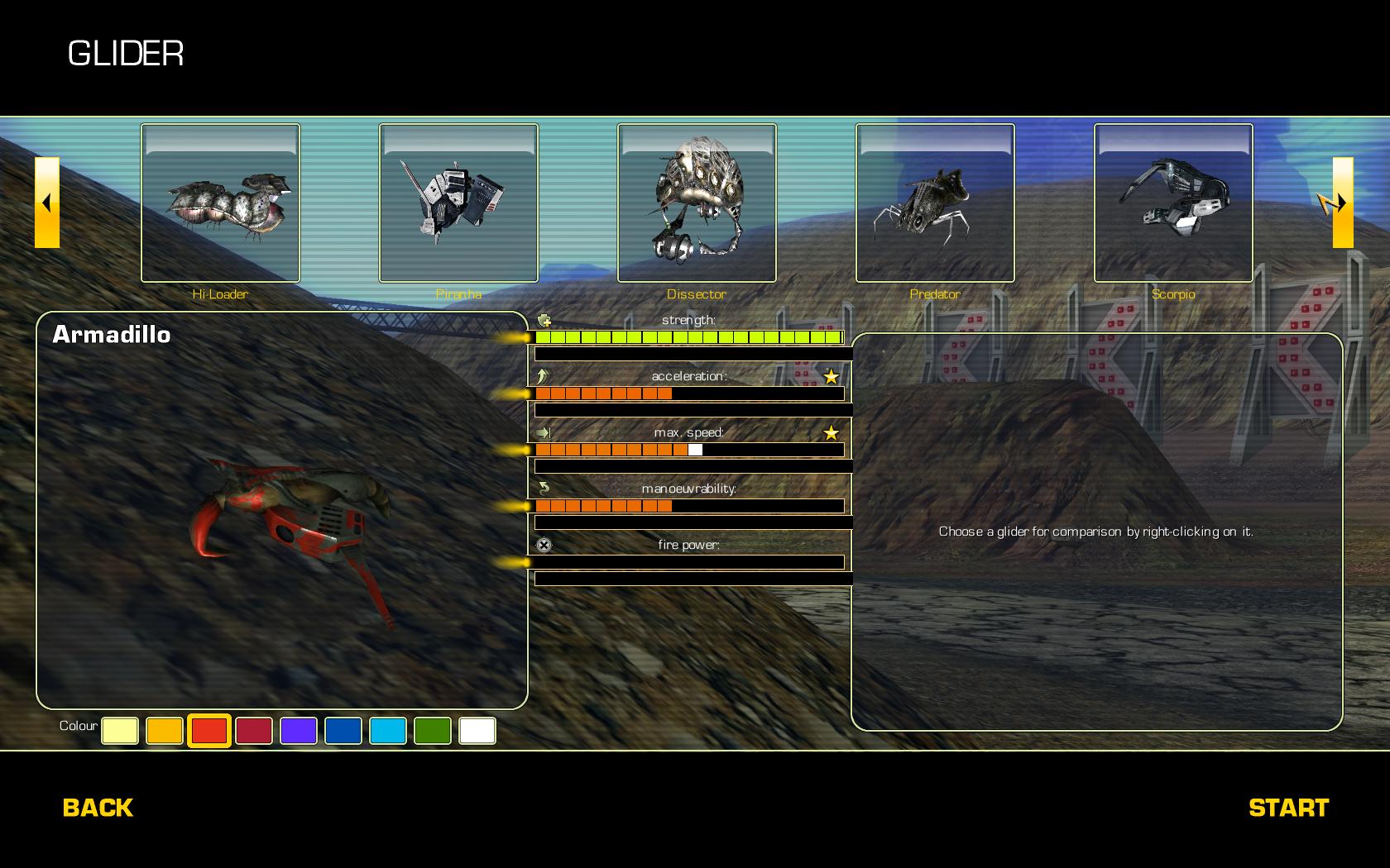 Čo sa vznášadiel týka, tak tých si autori pripravili slušnú porciu a ich počet sa vyšplhal na úctyhodných 30. V prvom rade sa líšia vzhľadom a pri niektorých budete mať teda silný dojem, že ich tvorcovia v dobe výroby hry fičali na nejakých halucinogénoch. Ľudia so strachom z hmyzu by si radšej mali držať odstup a to teda poriadny. Hlavne sa ale klzáky líšia v 5 vlastnostiach, ktoré priamo podmieňujú štýl hry a prakticky ponúkajú niečo pre každého. Vlastnosti sú to: odolnosť, zrýchlenie, maximálna rýchlosť, ovládateľnosť a palebná sila. Pre ťažkých pacifistov sú tu kúsky s takmer nezničiteľným štítom a vyváženou rýchlosťou, zrýchlením a ovládateľnosťou. Pre nerozhodných je tu z každého rožka troška a pre vojnových veteránov napríklad aj čistá palebná sila (Mastodon).
