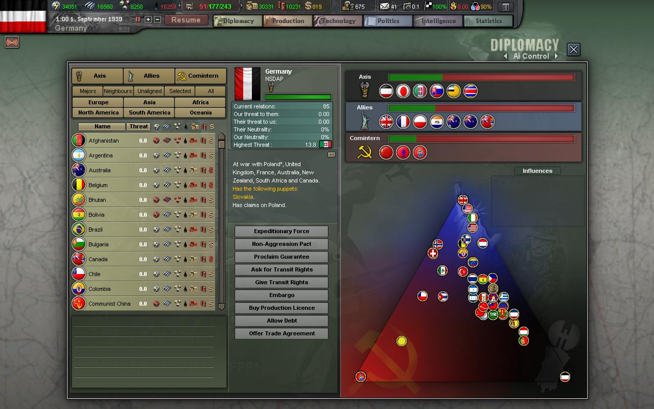 Na udržiavanie správneho chodu krajiny využívate menu so šiestimi zložkami, ktoré obsahujú viacero podskupín a slúžia na koordinovanie príslušných oblastí. Názvy hovoria sami za seba, je to diplomacia, produkcia, technológia, politika, spravodajstvo a štatistiky. V diplomatickom menu máte bohaté možnosti komunikácie s inými mocnosťami. Štáty sú tu triedené podľa ich vyspelosti, polohy, produkcie, politickej orientácie a bojovej strany vo vojne. Postoje jednotlivých krajín sú charakterizované polohou v pyramíde vplyvu, ktorá vám pomôže rýchlo posúdiť, aké šance môžete mať pri jednaniach. Samozrejme, že nacisti si nebudú rozumieť so Spojeneckými silami ani komunistami. Zvoleným štátom môžete zasielať obchodné ponuky, dohadovať nákup licencií, alebo vyvolať vojnu, žiadať poplatky, prechod ich územím, uvrhnúť embargo alebo prizvať do frakcie.