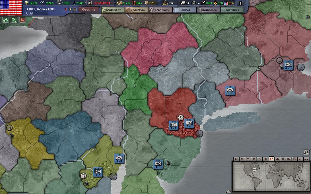Hearts of Iron III Globálna mapa má viacero zobrazení podľa rôznych kritérií.