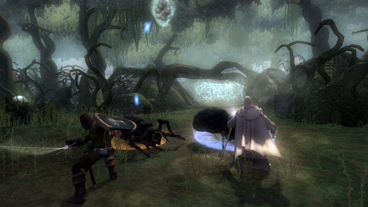Preto je lepšie po tomto, pomerne zbytočnom entré, začať pekne od začiatku, v pokoji domova, vo víre zelených lúk, malých domčekov a malebných kopcov. Hráč sa zhostí role mladého Froda Gamgeeho a pomáha tatkovi s prípravami festivalu, čo v praxi znamená zoznámiť sa s hrou. Postupne prejdete rôzne stánky a zistíte, ako používať meč a štít, že existujú štyri druhy úderov, naučíte sa blokovať i absolvujete cvičný súboj s trpaslíkom. Pomerne rýchlo sa naučíte vidieť podstatné body na mape – ľudkovia vám môžu čo-to povedať (bubliny/nápisy), dajú vám hlavný príbehový quest (zlatá hviezda) alebo vedľajší (strieborná hviezda). Práca s mapou je pritom hladká, ale nie nevyhnutná, po čase sa viete v lokalite orientovať aj sami. Príbehové questy sa snažia sledovať časť línie, ale neraz od nej odbočia, aby ju rozšírili. Vedľajší quest vás často prosí ísť hľadať stratené predmety či osoby, nájsť a doručiť určené artefakty a bojovať. Ale či už priamo v dedinke hobitov alebo aj neskôr v priebehu hry, náplň nie je úplne fádna a dokážete pri nej stráviť kopu času a nenudí. Iste, nemá prešpekulovaný príbeh a zo svojej podstaty vám ho ani nemá ako servírovať, keď trilógiu poznáte z knihy či filmov. Preto sa s dejom narába inak, často sa niektoré levely nechajú iba letmo inšpirovať alebo imitujú niektoré momenty. Platí to už pri Frodovi, ktorý sa s kamarátmi hrá napríklad na útek z pavúčieho hniezda alebo máte za úlohu zhodiť prsteň do studne a pritom vás akože sleduje Sauronovo oko. Opakujem, pre veteránov je to príliš ľahké a málo nápadité, ale pre mladučkého hráča ako stvorené.