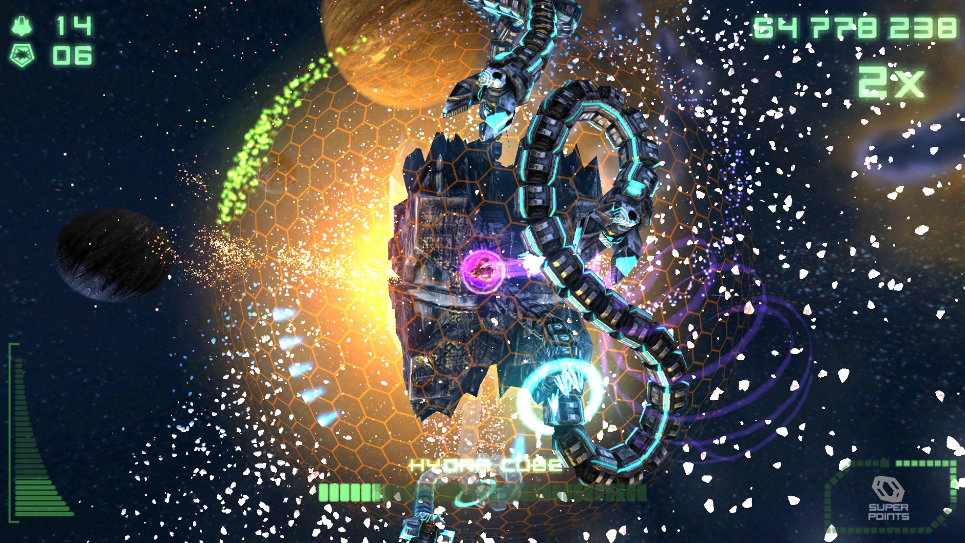 Delta je rovnako svižná ako HD verzia, beží na 60 fps, čo je poznať od prvého pohybu analogom. Ovládanie reaguje aj na to najmenšie vyklonenie páčok. Strely putujú presne tam, kam chcete, okolo asteroidov sa dá ladne obiehať, vysmievať sa krúžením, aj si ich vychutnávať z diaľky, keď sa účinok kanónu dočasne zvýši o 200%. Rozrezávané a zmenšované astereoidy vydávajú dobroty v podobe power-upov na trvalé zvyšovanie účinnosti palubných zbraní, bodové bonusy, život alebo bombu do zálohy, ktorou sa dá vyčistiť bezprostredná plocha jednoduchým odpálením.