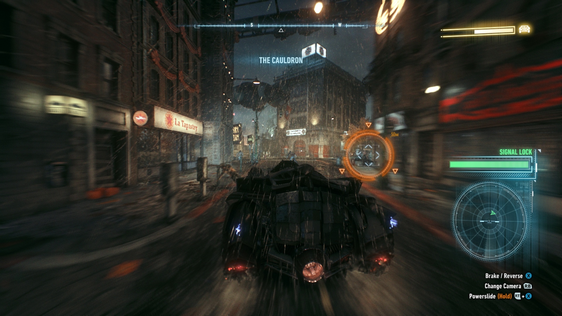 Batmobil je najväčším prírastkom do vášho tradičného arzenálu a až na jednu prekvapivú výnimku funguje rovnako. Zlodejov, chuligánov a výtržníkov na cestách dokážete spacifikovať gumovými projektilmi, drony ale zničíte hravo a efektne primárnymi a sekundárnymi zbraňami. Postupne si vozidlo viete vylepšiť a potom dokážete drony napríklad aj hackovať. Batmobil využijete pri rýchlom presune mestom (tradičné plachtenie tu však stále má svoje miesto), v boji a neraz aj pri riešení hádaniek, ktoré vás tu a tam slušne potrápia. Dokonca je súčasťou dvoch súbojov s bossom. Väčšinu hry funguje výborne, a to aj napriek nie práve ideálnemu jazdnému modelu. No občas je batmobilu naozaj trošku priveľa. Najmä, keď vás s ním hra núti skákať po strechách či pri repetitívnych naháňačkách. Dizajnovo je zvládnutý na výbornú (trochu v ňom badať inšpiráciu z Gigerovho konceptu pre Batman Forever) a má dva režimy, každý pre inú činnosť.