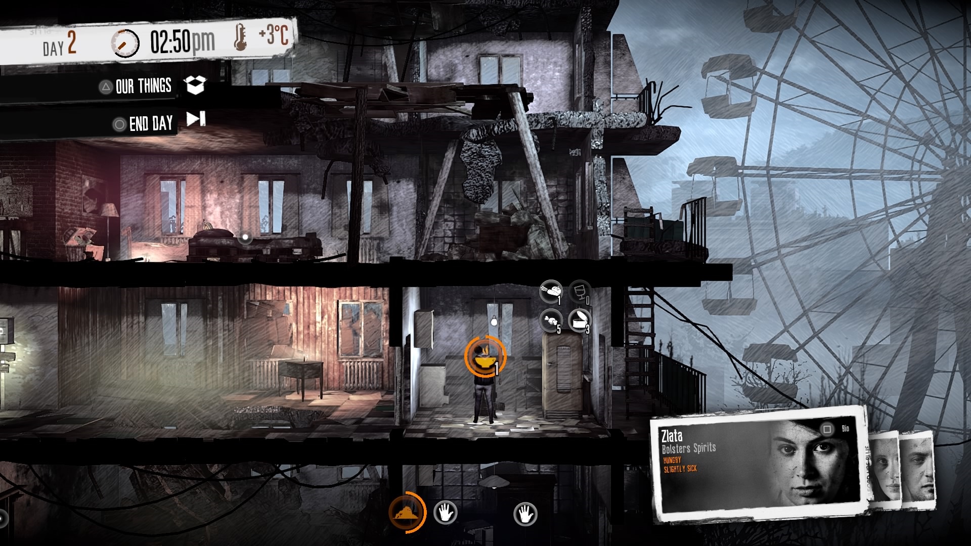 Zaujímavý feeling budete mať predovšetkým z atmosféry. Hrateľnosť je svojím spôsobom jednoduchá, jednotlivé herné prvky postupne odhalíte a pohodlný pochod hrou vám zvrátia prvky náhody. Pretože taký je život a vojna dvojnásobne. Netreba mať na papieri titul z jadrovej fyziky, aby ste vedeli, čo znamená prázdny žalúdok, depresia, choroba - a tomu všetkému budete neustále čeliť. Nenastane chvíľa pokoja, kedy by ste užívali ten skvostný pocit, keď ide všetko tak, ako má. Časový limit vás núti voliť činnosti podľa efektívnosti, pretože všetko nestihnete ani s trojicou v dome. Ľudia nemôžu stáť neustále na nohách, unavení obyvatelia sú cestou do horúcich pekiel, pretože morálka skupiny prudko upadá a pre jednotlivé postavy sa ako jediné riešenie javí samovražda.