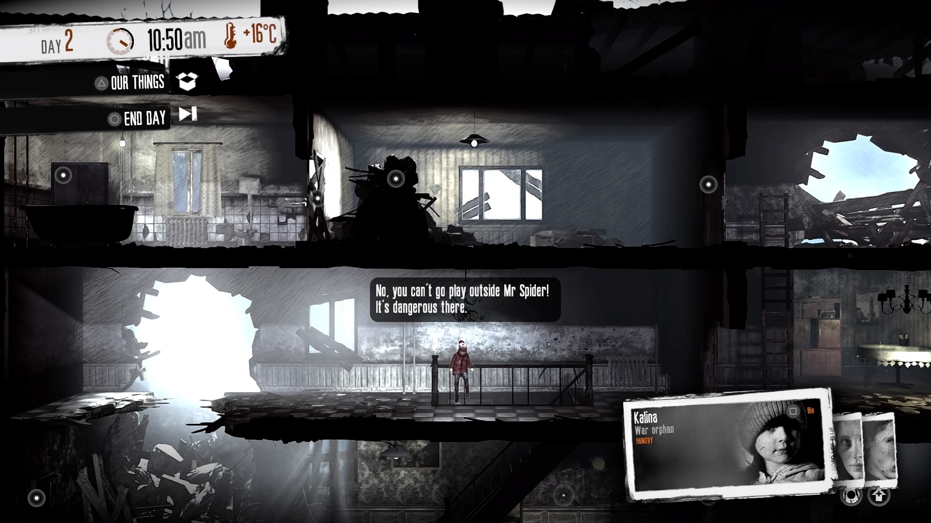 V prípade, že ste si zatiaľ vojnu z pohľadu civilistov neskúsili, určite to napravte. This War of Mine ponúka mnoho lákadiel, hoci sa tak spočiatku netvári. Dvojrozmerné prostredie sledované z „plošinovkového” pohľadu možno nevyzerá dôveryhodne, ale nenechajte sa oklamať a spomeňte si napríklad na Deadlight. Na začiatku si vyberiete obyvateľov, o ktorých sa budete musieť starať, hra vám vygeneruje prostredie, kde strávite dni plné strachu a kde sa neodpúšťa ani tá najmenšia chyba. Cez deň upravujete ošarpanú budovu, vaše nové útočisko, vyrábate predmety uľahčujúce náročný život, varíte, liečite sa, vyrábate hmotné staty. V noci vyrážate do iných oblastí, kde naopak grindujete rôzne predmety. Občas natrafíte na obchodníka, inokedy vás navštívia iní občania sužovaní vojnou so žiadosťou o pomoc. Smrť na vás číha hlavne pri strete s banditmi, no taktiež nie je múdre nepočúvať civilistu s nožom v ruke, ktorý vás upozorňuje, aby ste mu nekradli jeho veci.