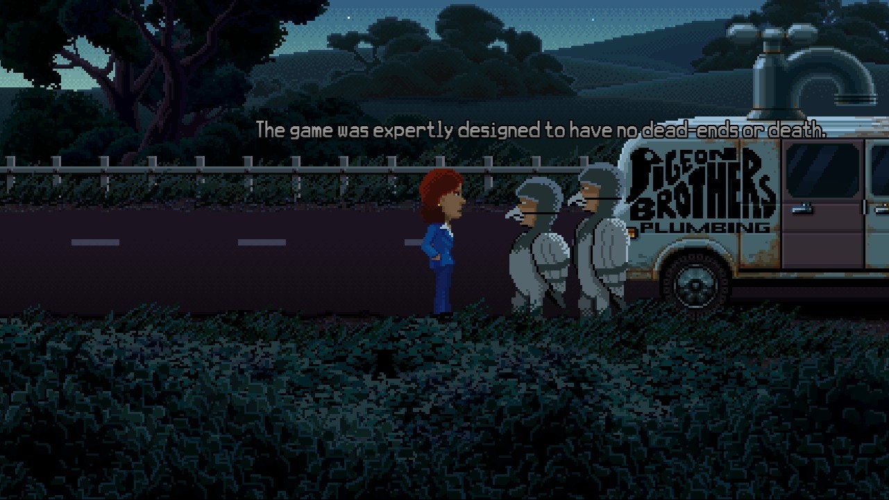 Prezrádzať čosi viac z príbehu je dvojsečnou zbraňou. Prídete si na to sami a o to väčšia zábava to pre vás bude. Thimbleweed Park je niečo na štýl Lynchovho Twin Peaks, možno trochu zriedené Kingovym Derry či záhadami z Aktov X. A teda viac než podivné mestečko. Ale len tak naoko a zabalené do poriadne vtipného obalu. Vražda je vražda, potenciálnych vrahov hneď niekoľko, no korunu tomu dodávajú vedľajšie postavy, ktoré nielenže spovedáte, ale za mnohé z nich si zahráte (nielen) v retrospektívnych rozprávaniach. To si tak spokojne vyšetrujete, keď tu zrazu vám niekto začne rozprávať príbeh z minulosti a už to ide. Vyskúšate si kožu arogantného klauna (aj my sa tešíme na filmové To), nádejnej programátorky MMucasFems Games (mrk mrk, LucasArts), ducha vynálezcu Franklina. Žiadna z týchto odbočiek nie je samoúčelná a predstaví vám postavy, ktoré sú späté s vašim prípadom, vynikajúco sa prezentujú, je radosť za ne hrať, hoci sa povahovo odlišujú.