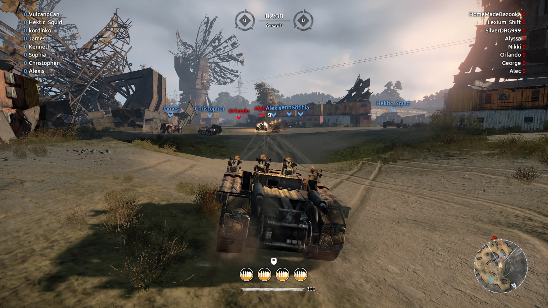 V každej dobrej MMO máte príbeh. Málokedy ide o zápletku, ktorú by ste sledovali s nadšením, ale vždy tu nájdete aspoň niečo. Crossout na to ide úplne inak a nie najlepšie: vyber si herný mód, my ti priradíme mapu, postav a zvoľ si auto. A už sa to nahráva, bez zdržovania vyrážate s ostatnými hráčmi, hučiacimi motormi a strieľajúcimi zbraňami oproti nepriateľovi. Nenájdete tu žiadny otvorený svet, len sedem máp, ktoré sú síce zaujímavé, ale stále je ich málo, navyše ich rozloha je skôr skromná. Pri hre 8 vs. 8 sa aspoň dlho hráči nehľadajú, no následne to koliduje s nižším počtom samotných máp. Je to skutočne málo.