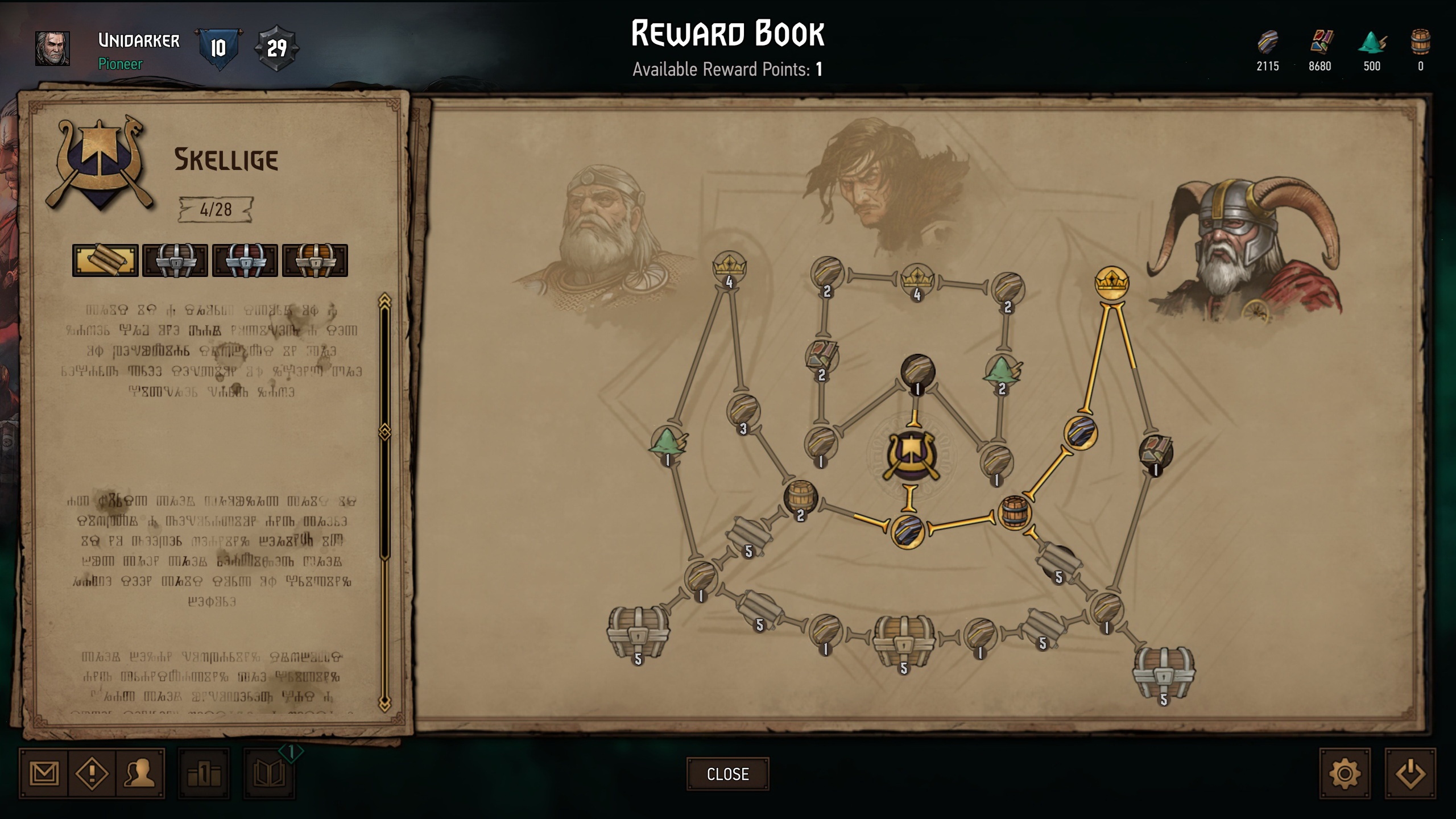 Prakticky za všetky, aj banálne aktivity v hre (plnenie denných úloh, odohranie x zápasov alebo otvorenie sudov, výrobu karty, spotrebovanie surovín, prvé použitie GG označenia s bonusom pre protihráča po dueli atď.) získavate body, ktoré investujete v knihe odmien. Tam ich vkladáte do ľubovoľných hrateľných frakcií, pričom každá ponúka rozvetvený strom, kde si naklikáte suroviny, sudy, truhlice a odomknete ďalších lídrov. Tí majú tiež vlastné stromy s podobným obsahom. Hlavne spočiatku je tento bodový systém výbornou motiváciou pri hraní.