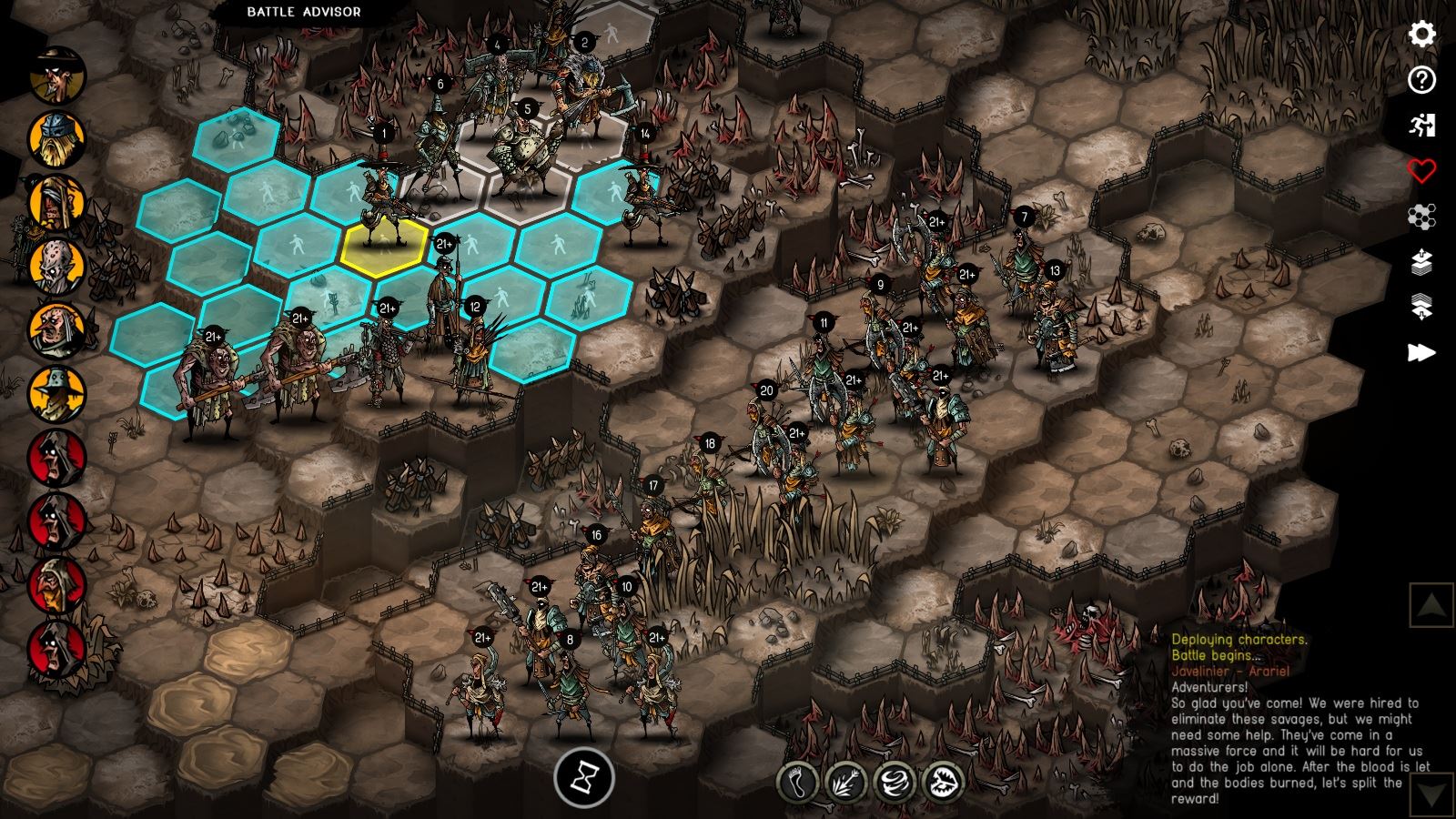 Hra vás už pri prvom súboji s nepriateľmi prekvapí detailným tutoriálom, ktorý vám presne vysvetlí to, čo v danej chvíli potrebujete vedieť. Každá informácia ohľadom boja, útokov či predmetov je jednoducho a jasne rozpísaná, k čomu dopomáha aj grafický dizajn ikoniek a prehľadný HUD. Pred každým súbojom si môžete takticky rozmiestniť vaše postavy. Boj je, pochopiteľne, na striedavé ťahy a odohráva sa na šesťuholníkovej procedurálne generovanej mapke s rôznymi úrovňami terénu. Nie každý takýto šesťuholník je bezpečným miestom. Môže obsahovať rôzne typy nebezpečných elementov, ako sú kamene, hroty alebo blato, ktoré spôsobia vám alebo nepriateľovi určitú ujmu, poškodenie či rovno smrť, keď na nich stojí alebo cez ne prejde.