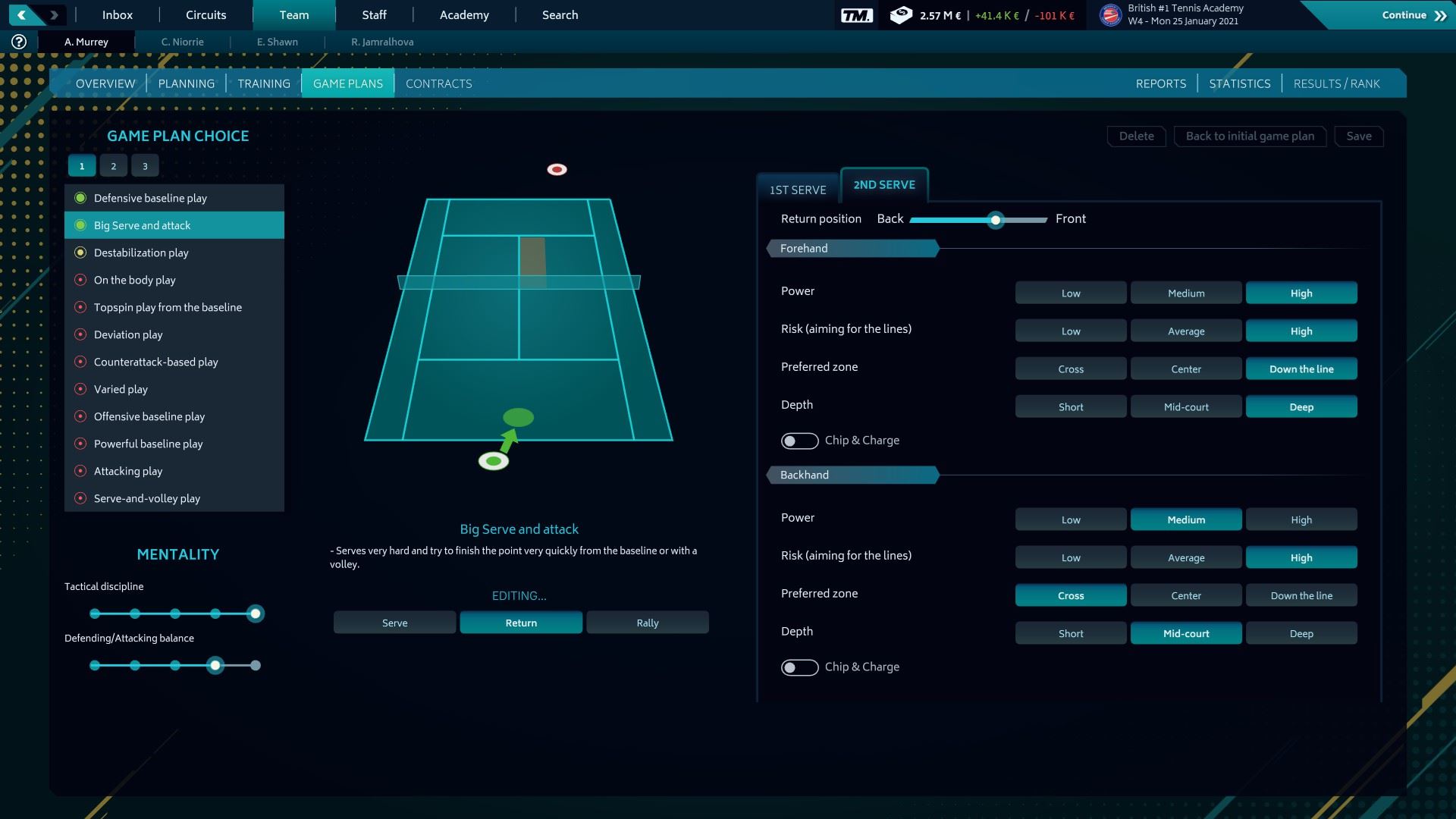 Tennis Manager 2021 sa snaží tváriť nesmierne komplexne. Obsahuje všetko to, čo jeho futbalový konkurent, no v značne orezanej forme. Na začiatku máte vo svojom tíme len duo hráčov, ktorí sa vám prezentujú aspoň niekoľkými atribútmi (technické ako servis, lob, backhand alebo vlastnosti hráča ako rýchlosť, sila či mentálne schopnosti). Tie sa samozrejme snažíte zlepšovať, avšak progres je pri miernom tréningovom zaťažení nesmierne pomalý a najvhodnejšie je orientovať sa vo vysokej intenzite konkrétnym schopnostiam aj za cenu zvýšenej únavy. Práve tréningový proces je jeden z najdôležitejších v hre a voľba jednotlivých trénerov, ktorých budete zamestnávať vrátane vami vytvorenej postavy má vplyv na hru. Musíte vedieť správne vyhodnotiť, kde sú slabiny hráča, kde má zmysel, aby sa zlepšil a využil svoje prednosti v taktickom nastavení počas zápasu. A to skutočne funguje. Môžete riskovať, hrať na istotu a to všetko prispôsobovať súperovi na kurte.
