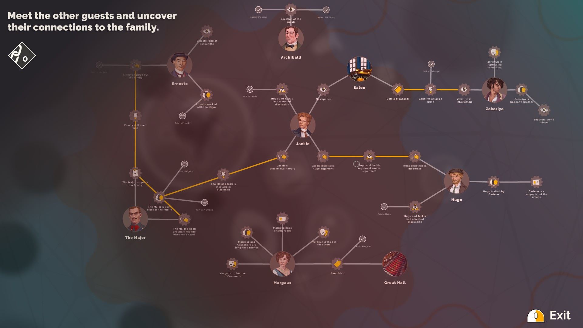 Kým sa však k vyriešeniu dostanete, ubehne niečo cez desať hodín herného času a nedá sa povedať, že by ste sa museli zapotiť. Stačí sledovať odporúčania hry a ak budete tápať, hra vám sama napovie, ktoré stopy sa oplatí spojiť a potom nasleduje tradičné trieskanie si hlavy o najbližšiu stenu. Samozrejme, môžete všetko pracne vyklikať, no všetky dedukcie majú logický kontext. K dispozícii máte obrazovky s dedukovaním a zapísanými stopami. Tie sú rozdelené podľa otázok, na ktoré potrebujete nájsť odpovede. Užitočné sú aj profily jednotlivých postáv, ku ktorým sa automaticky zapisujú dôkazy a odpovede na jednoduché otázky typu: mohol byť vrah, mal motív, kde sa nachádzal, osobné tajomstvá, fakty a podobne. Prehľadnosť je na prvom mieste.