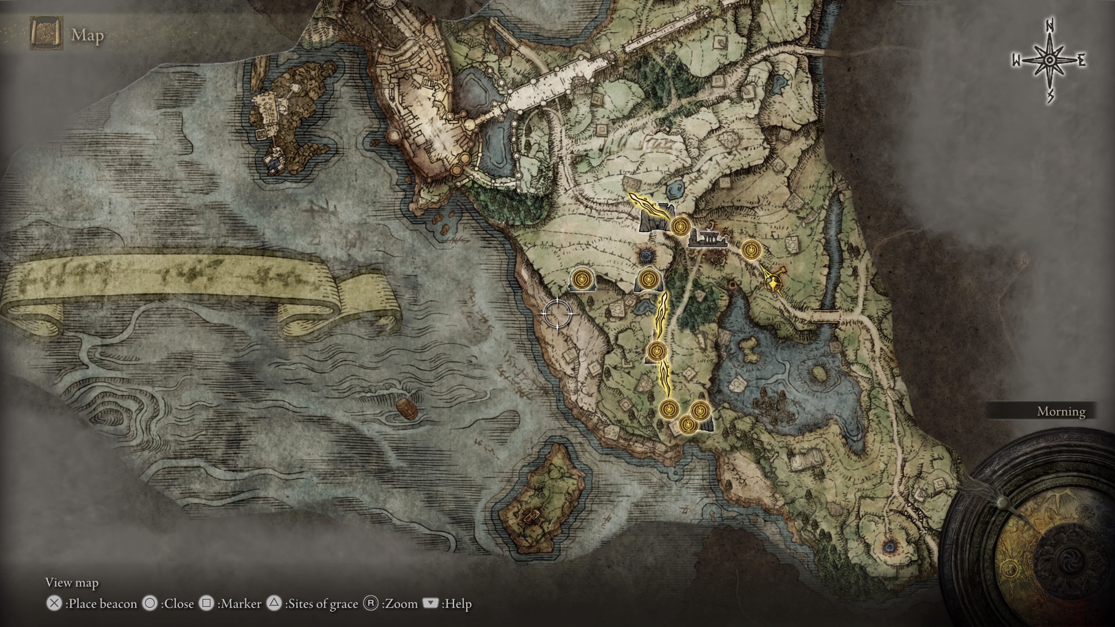 Mapu Lands Between môžete objavovať postupne, ako vás navádza príbeh, alebo podobne chaoticky ako ja. Ak je teda pre vás lákavou každá teleportačná brána alebo pasca v truhle, ktorá vás premiestni cez celý kontinent, hrdo choďte do toho! Mapu neskúmate ako nejakú po vežiach loziacu Ubisoft akciu, ale skúmaním sveta odstránite hmlu ktorá svet zahaľuje. To vám však neposkytne obraz o samotnom svete, to spraví až útržok mapy, ktorý nájdete vždy pri začiatku zatiaľ nepreskúmanej oblasti. Takúto mapu nájdete pri kamennom obelisku a zobrazíte si tak krásne maľovaný a detailný svet. Žiadne ikonky však na mape nečakajte, tie sa zobrazia jedine vaším putovaním. Objavovaním každého nového Site of Grace sa zároveň z tohto žiarivého svetielka stane miesto na rýchle cestovanie, na ktoré sa môžete premiestniť kedykoľvek a priamo z otvorenej mapy.