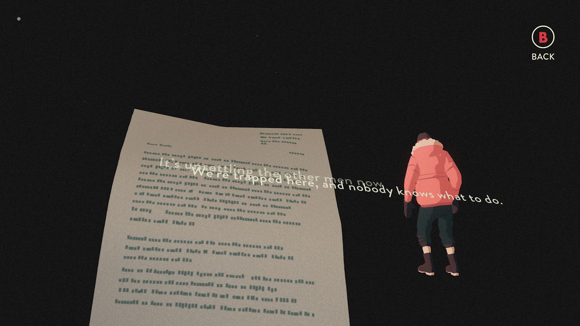 A kto je vlastne Peter? Prečo je tu? To sa dozviete v ďalších 3-4 hodinách, kedy hra rozpletie svoje tri príbehové kapitoly. Príbeh prebieha v dvoch rovinách. Jedna sa odohráva v skutočnosti, kedy Peter bojuje o život v mrazivých podmienkach. Druhá rovina sa zase odohráva v jeho hlave, kde si prehráva to všetko, čo ho až sem doviedlo. V priebehu rozprávanie máte dojem, že z Petra postupne prestáva byť dôveryhodný rozprávač a ako sa dve roviny začínajú čoraz viac prelínať, vy už tušíte, že sa príbeh môže zamotať aj nečakaným spôsobom.