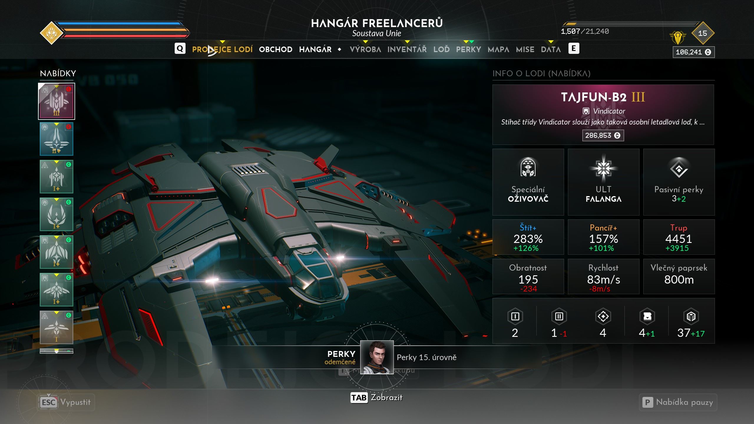 A potom sú tu perky s unikátnou štruktúrou. Tie základné súvisia priamo s vašou postavou a vždy po dosiahnutí určitého levelu si môžete vyberať jeden nový perk s jedinečným bonusom (napríklad loď v kritickom stave ešte nevybuchne, ale na desať sekúnd sa stane nesmrteľnou). Tieto perky sa pritom dajú dodatočne meniť. Zaujímavejšie je získavanie perkov vašich spoločníkov. Každá postava, ktorá sa stane súčasťou vášho tímu, prináša nejaké špeciality, ktoré získate permanentne, ak nahromadíte požadované kredity a suroviny (kovošrot, chladiace jednotky atď.) Takže potom dokážete na diaľku posielať prebytky z inventára na svoju základňu, zničení nepriatelia uvoľňujú energetické gule, zvýši sa dosah lúča na priťahovanie vecí vo vesmíre, budete mať extra palebnú podporu a podobne. Aj za toto palec nahor.