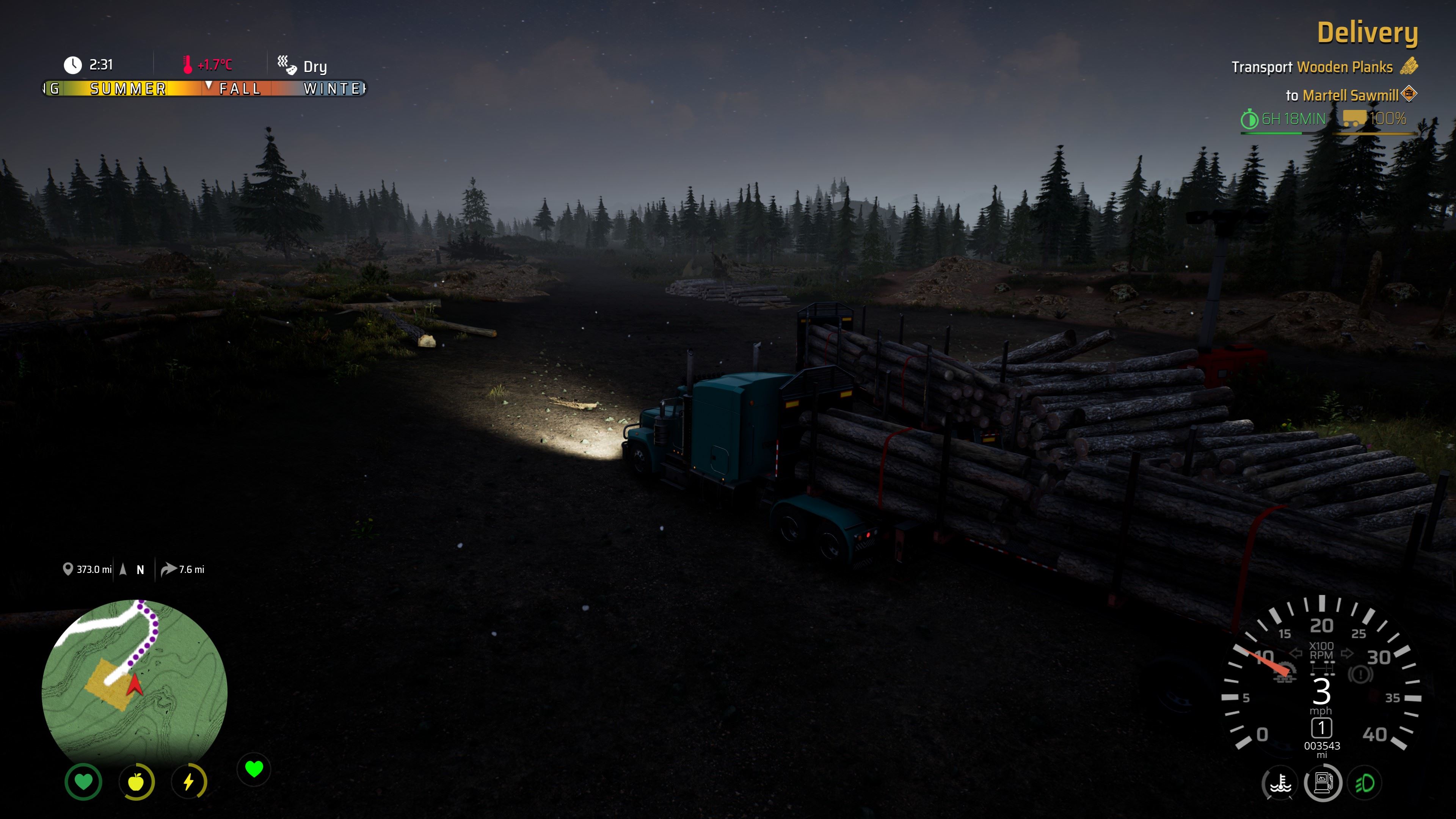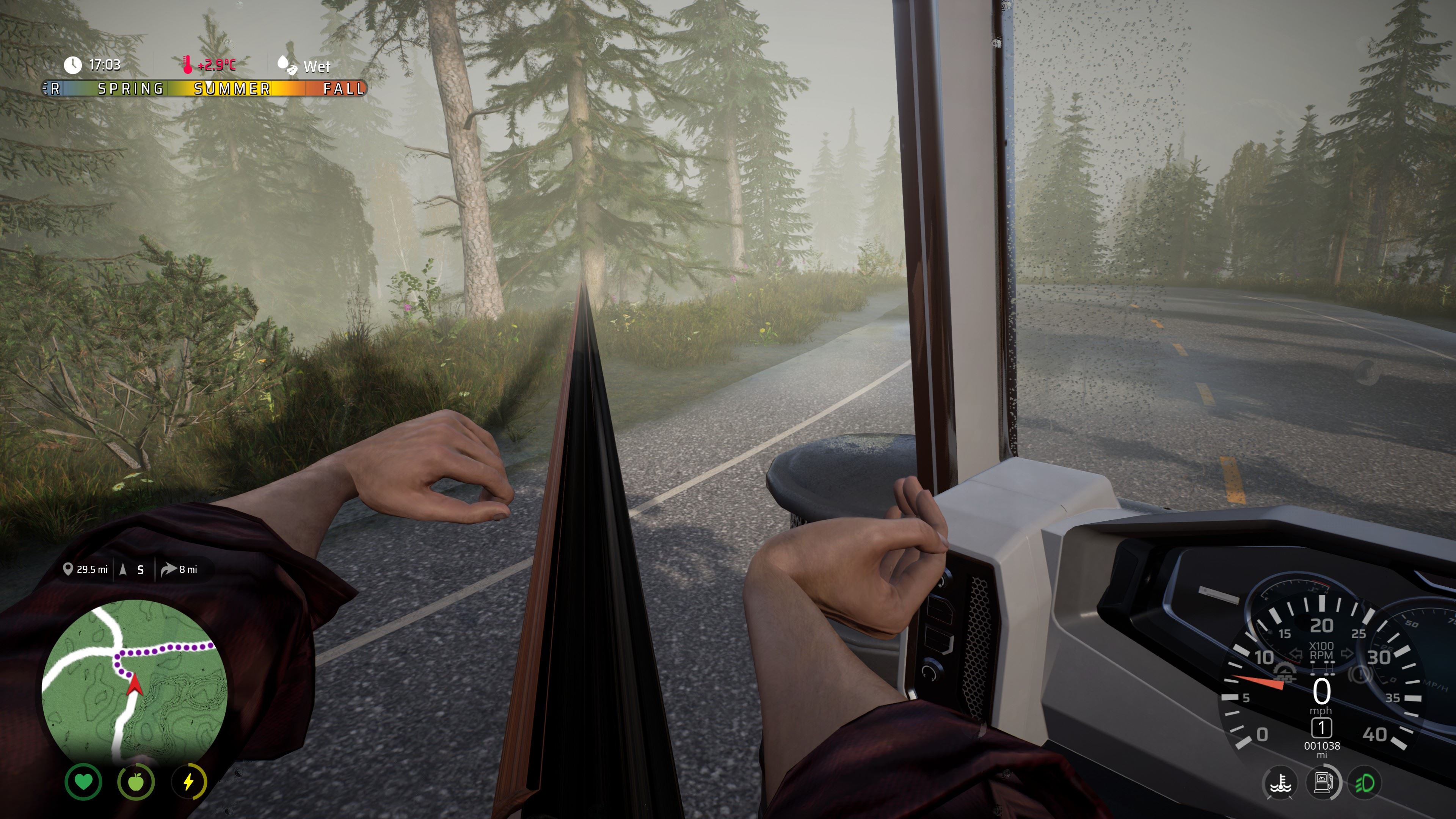 Nakupovanie jedla a rôznych potrieb pre kamión sa deje na benzínových pumpách, kde skôr nájdete instantné jedla, ktoré nepotrebujete zohrievať, no zároveň vás príliš nezasýtia alebo v obchodoch, kde majú pestrejšiu ponuku. Kúpite si mrazené lazane, pizzu, mäsové guľky a zopár ďalších, dáte do mikrovlnky, prejde pár sekúnd a môžete jesť. Survival taký prepracovaný, že The Long Dark ide z môjho disku. Do kamiónu budete dokupovať olej, chladiacu zmes, sadu na opravovanie, sviečky, stierače, kryt na chladič, reťaze na kolesá a určite si vezmite aj motorovú pílu či teplejšie oblečenie. Motorovka je super. Ak na cestu spadne strom (skrátka sa to občas deje), tak ho buď obídete (ostatné autá sa otáčajú a idú späť, hoci miesta na prejdenie je tam dosť) alebo si aktivujete schopnosť používania motorovej píly, zakúpite si túto krásku a strom odstránite. Čiže vystúpite z kamiónu, prídete k stromu, stlačíte E, náš hrdina naštartuje kutilského miláčika od čias Dooma, otočí sa o 360 stupňov a strom je preč.