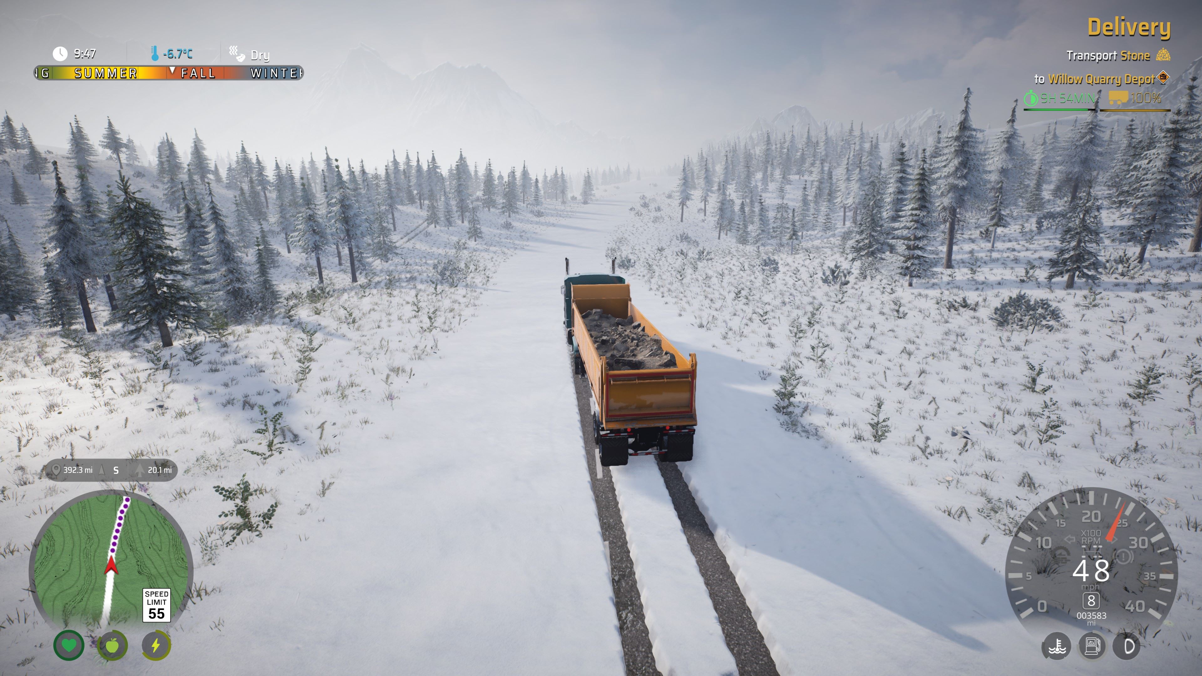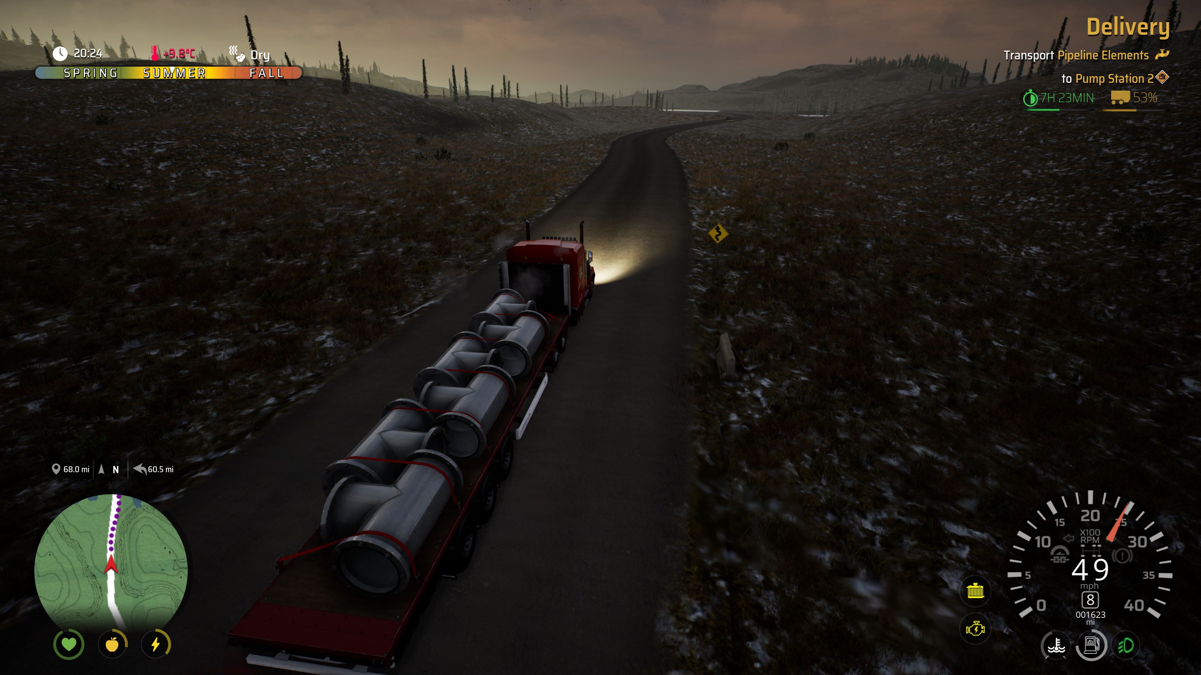 Cieľom je jediné: zbohatnúť, zväčšovať svoj vplyv, kupovať si nové trucky a prevážať tovar sem a tam, zhora dole a to všetko po tých istých trasách. Cesty spočítate na prstoch oboch rúk. Mapa v Alaskan Road Truckers nie je príliš veľká a jazdíte po tých istých trasách. To, že sú monotónne, nezaujímavé môžeme hodiť na vrub samotnej Aljaške. Zábave to však rozhodne nepomáha. Hornaté prostredie má svoje čaro a pri zmene dennej doby zažijete niekoľko pútavých zážitkov, ale ide o zanedbateľné percento oproti konkurencii. Navyše sa Alaskan Road Truckers snaží, a to celkom úspešne, podporiť hranie striedaním ročných období. Na jar leje, cez leto je pekne, jeseň je skôr tmavá a v zime je všade sniežik. Pekné. A to je tak všetko, hoci na snehu je väčšia zima a musíte zatepliť motor, kúriť v kabíne a šmýka sa to, takže pomôžu snežné reťaze.