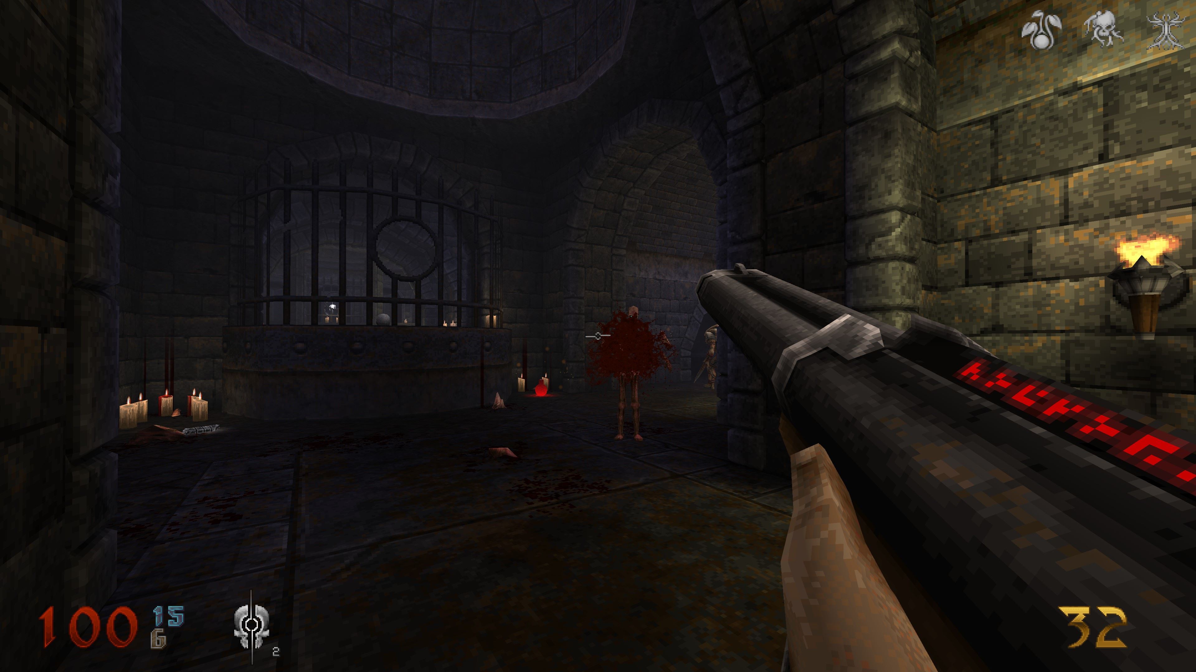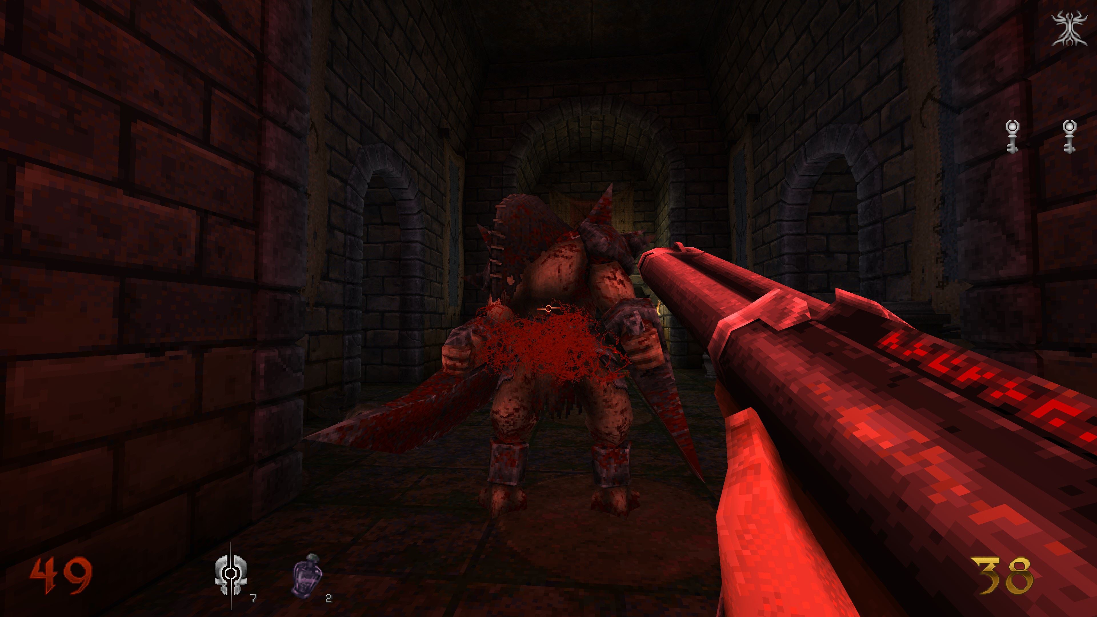 Grafické prevedenie je také, aké je. Je to zázrak, ale na 4K monitore mi pixelová grafika vôbec neprekáža, oči si zvykli a vôbec nemám potrebu riešiť, že to je vlastne staré. Engine je z prvého Quake a nikomu to nevadí, hlavne, že je to plynulé, dobre sa to hýbe a nepadá to. Je to rýchle, funkčné a bez najmenšej chyby. Teda až na tie zaseknuté mŕtvoly vo vzduchu, ktoré akoby zastali v čase a pôsobia nepatrične v hre, ktorá by mala byť bezchybná. Je to problém enginu? Možno, ale nepatrí to do hry. Hudobný sprievod je, aký má byť, možno by si zaslúžil viac skladieb. Ale zvuk brokovnice je jednoducho takmer „orgazmický". Veď to poznáte!