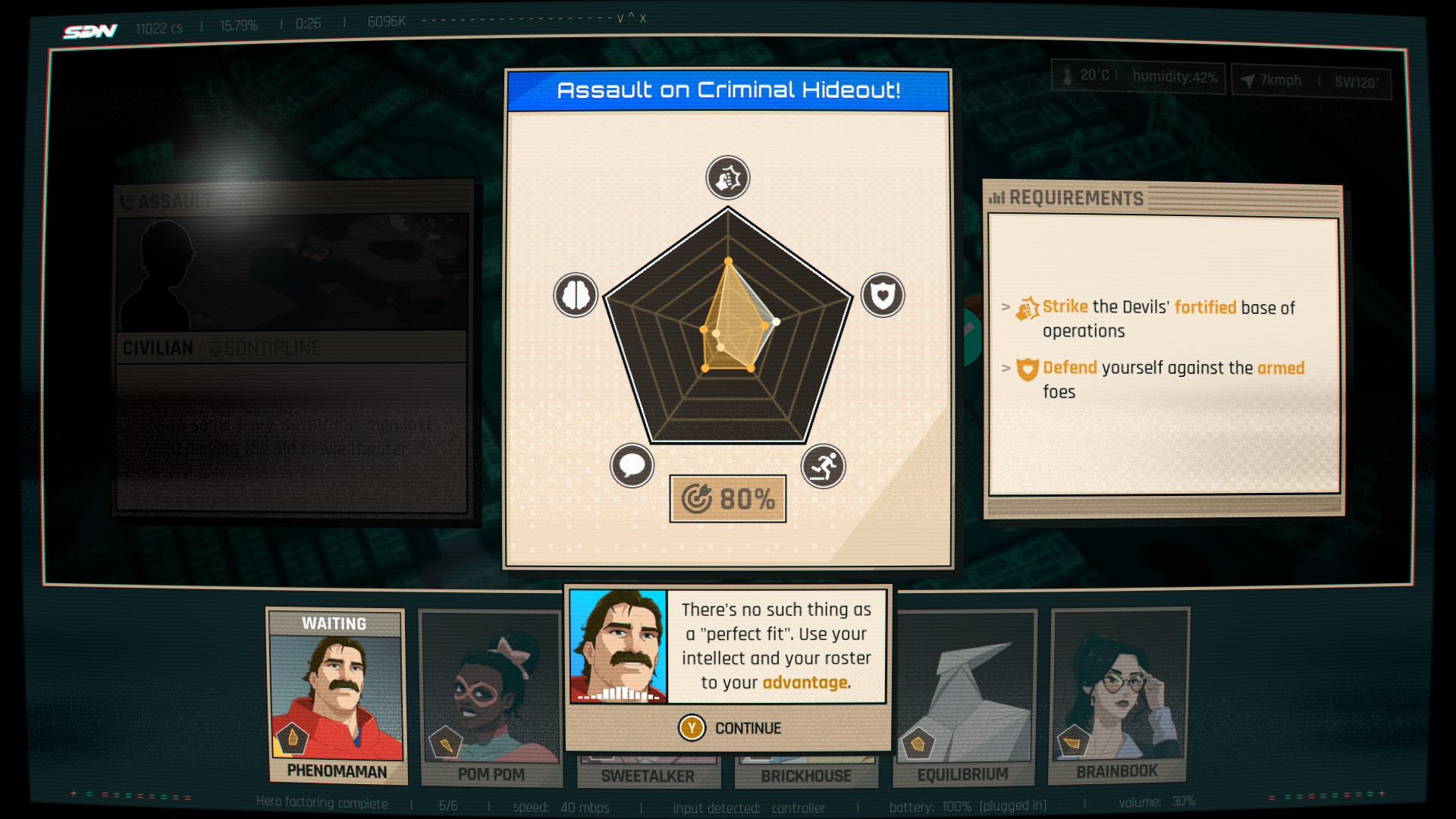 No a potom je tu tá druhá časť, ktorá je vlastne manažmentová. Robert ako dispečer raz-dvakrát za epizódu sadne za počítač s mapou mesta a vysiela svojich zverencov na úlohy, ktoré si vyžadujú rôzne skilly. Každá postava má 5 atribútov, v niektorých je silná, v iných slabšia. A vy musíte na danú úlohu nasadiť správnu postavu alebo tím postáv. Často sa úlohy prelínajú a postavy potrebujú aj oddych. Inokedy ich zase demotivujú v akcii vaše rozhodnutia z príbehových scén. Prípadne sa môžu zraniť pri neúspešnej misii. To všetko má vplyv na ďalší úspech a poprekladané je to hackovacími minihrami, keďže je Robert ako bývalý Mecha Man skúseným technikom schopným poradiť si s mnohými problémami aj na diaľku.