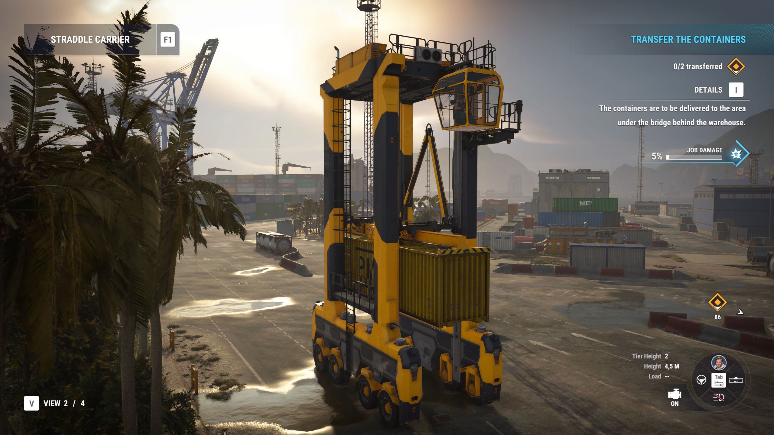 Straddle Carrier po vás bude vyžadovať pomalé, no precízne pohyby, napríklad ponad zaparkované nákladné autá alebo naskladané kontajnery. Rovnako ako pri STS žeriave viete operovať s rôznou šírkou ramien, ako aj s uchytením pomocou lán, pričom nechýbajú menšie úpravy smeru ramena, aby ste nemuseli dosahovať optimálnu polohu ramena pomocou posunu celého žeriavu. To isté platí aj pre Reach Stacker, no ten vám umožní meniť nielen výšku fixného ramena, ale viete meniť aj jeho dĺžku. To sa hodí pre ťažko prístupné miesta alebo dlhé presuny naprieč prístavom. Vozidlom, ktoré prakticky úplne mení herné mechaniky žeriavov, je terminálový traktor, pomocou ktorého viete presúvať odstavené prívesy a návesy. K nim budete musieť presne cúvať a pripojiť potrebné káble. No nemyslite si, že hra vás vždy pošle len na jednoduché široké parkoviská. Ocitnete sa v situáciách, kedy sa jednoducho budete musieť naučiť princíp cúvania a manipulácie s prívesmi. Poslednými dvomi ovládateľnými vozidlami sú RTG a RMG žeriavy, ktoré ovládaním pripomínajú STS žeriav.