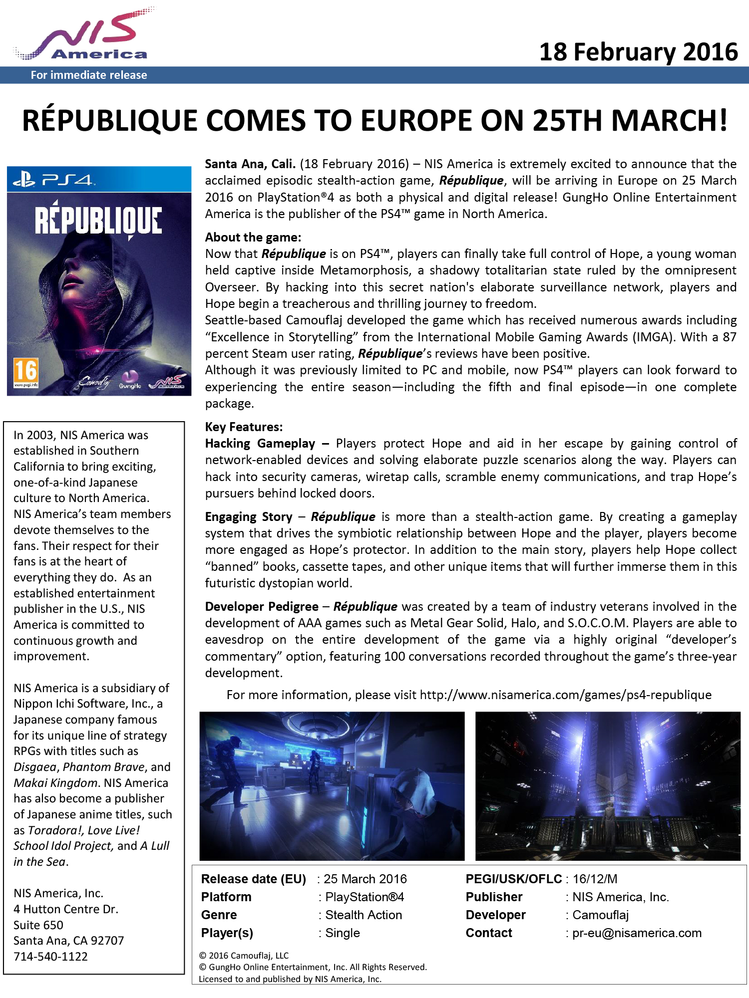 Epizodická stealth akcia Republique, v ktorej sa dostanete do ženskej postavy Hope - hackerky, ktorá chce odhaliť národné tajomstvá a získať vytúženú slobodu. O vydanie na západe sa postará NIS America, pričom do obchodov sa dostane už 25. marca.