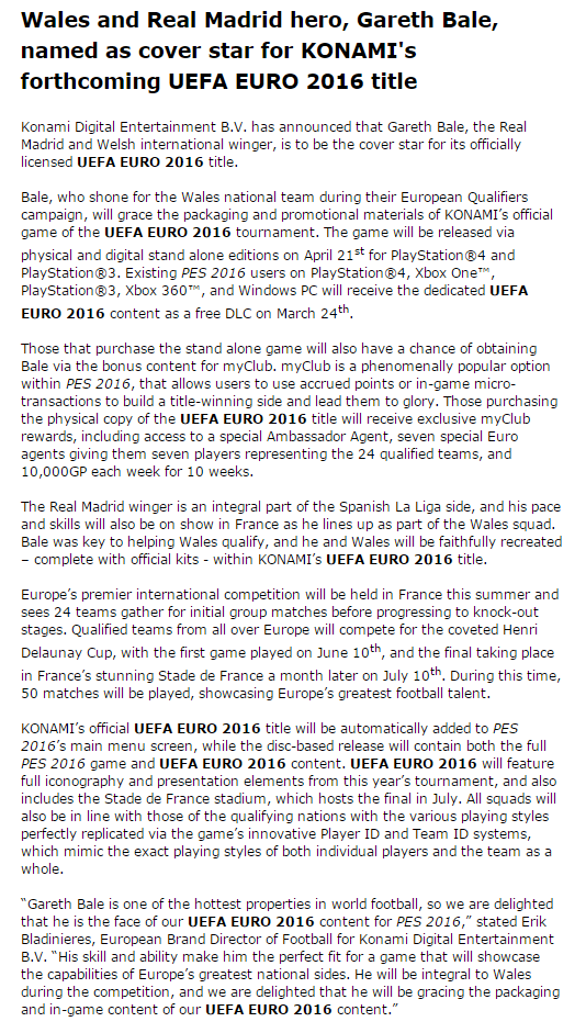 Konami si zabezpečilo naozaj obrovskú hviezdu na obal UEFA EURO 2016. V drese Walesu je to hráč Realu Madrid Gareth Bale, ktorý v základnej skupine nastúpi aj proti futbalistom Slovenska.